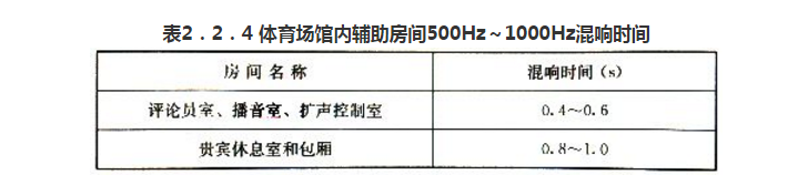 體育場(chǎng)館內(nèi)對(duì)聲學(xué)環(huán)境有較高要求的輔助房間的混響時(shí)間宜符合表2.2.4的規(guī)定。