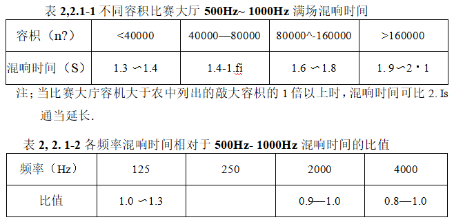 1在頻率為500Hz?1000Hz時,不同容積比賽大廳的滿場 混響時間宜滿足表2. 2.1-1的要求。