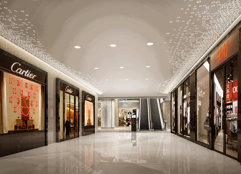所以我們吸聲材料布置的主要位置是頂棚,對于“一”字型的廣場式平面商業(yè)賣場,由于這種體型的面積大,頂棚是吸聲量的主力軍。在這里我們可以使用AGG功能性吸聲系統(tǒng)(無縫造型玻纖板)和吸聲暗插板來迎合裝飾效果,達到裝飾吸聲的雙重作用。
