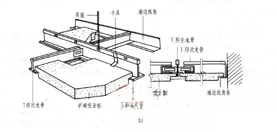 (1)明龍骨安裝構(gòu)造。將齊邊的方形或矩形礦棉吸聲板直接擱置在倒T形次龍骨的翼緣上,如下圖a)所示。