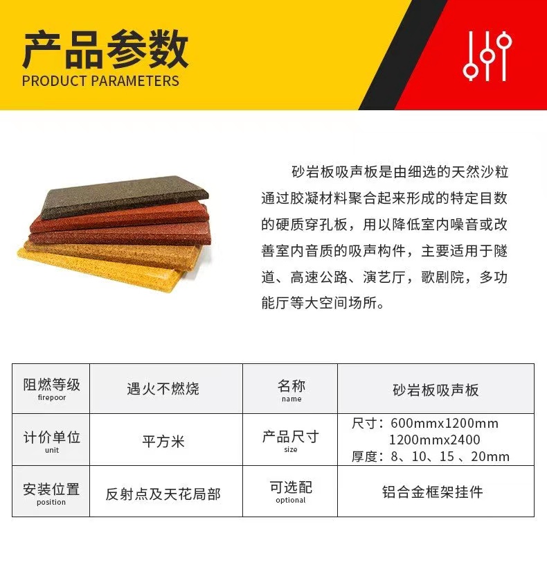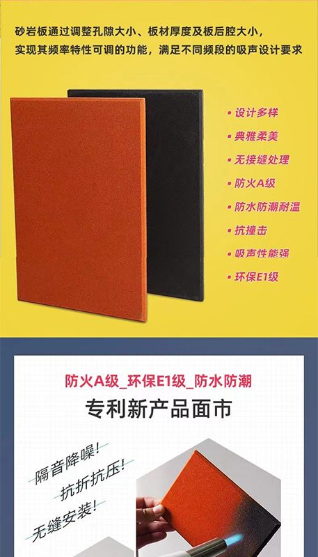 砂巖吸音板是由精選的天然的砂粒通過膠凝材料聚合起來形成的特定目數的硬質穿孔板,可根據多孔材料及微孔共振吸聲機理,通過調整孔隙大小、板材厚度及板后空腔大小,實現其頻率特性可調的功能滿足不同頻段的吸聲設計要求。
