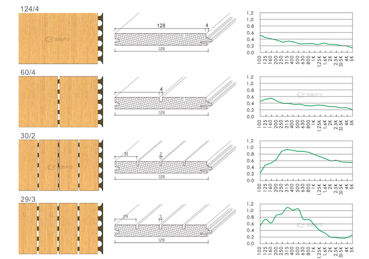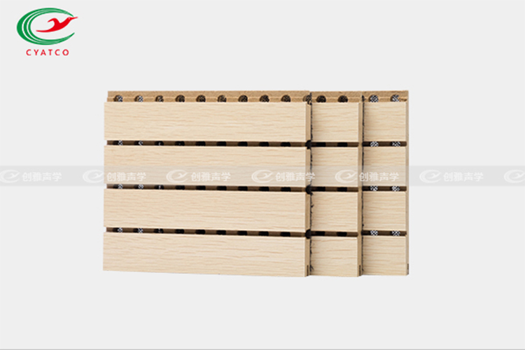 在聲學(xué)功能方面,槽木吸音板是一種狹縫共振吸聲材料,具有優(yōu)秀的吸音降噪功能,尤其對(duì)中、高頻的聲音效果尤為顯著。槽木吸音板是由密度板正面開(kāi)槽、背面穿孔加上吸音氈組成的吸音材料,飾面可以根據(jù)風(fēng)格需求定制,有各種實(shí)木貼面、烤漆面、油漆面和其他飾面,常用規(guī)格有2面1槽、3面2槽、6面5槽等,不同型號(hào)的吸聲系數(shù)也不同