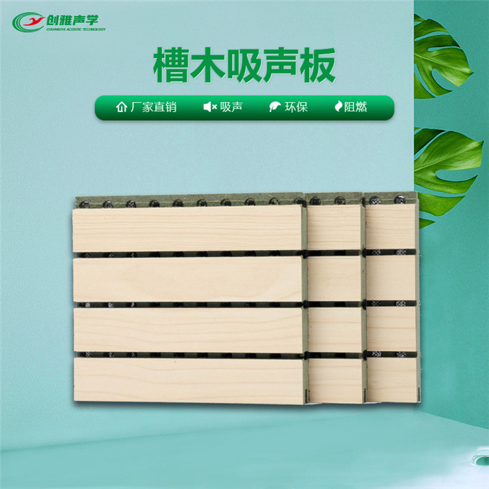 創(chuàng)雅聲學(xué)的槽木吸聲板是一種在密度板正面開(kāi)槽,背面穿孔的共振吸聲材料。