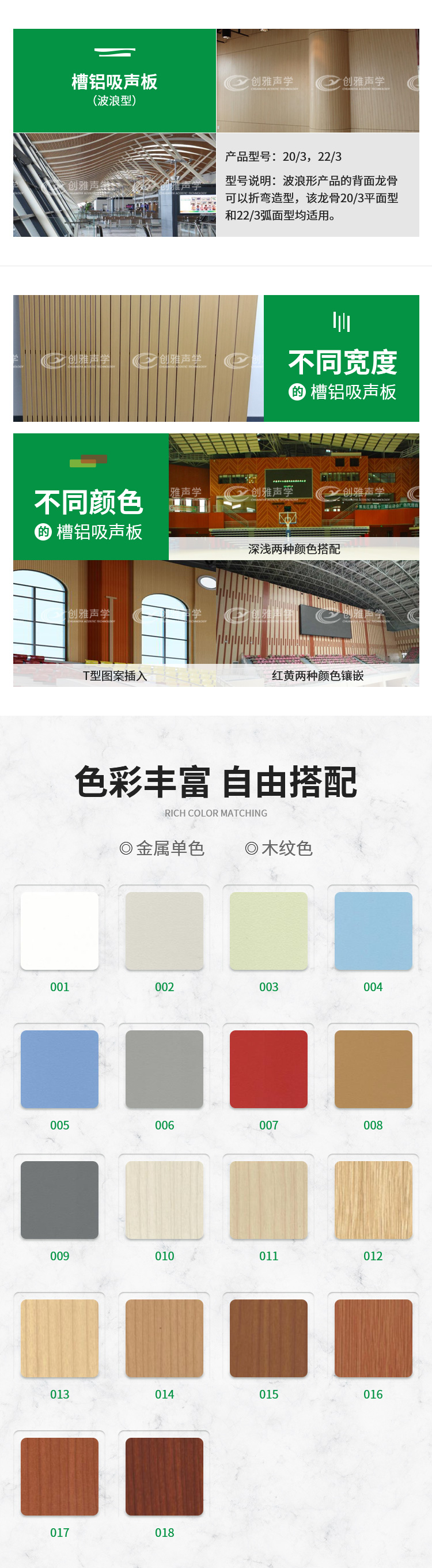 對高頻、中頻、低頻均有很好的吸聲性能;可多種顏色、不同寬度任意組合。 |