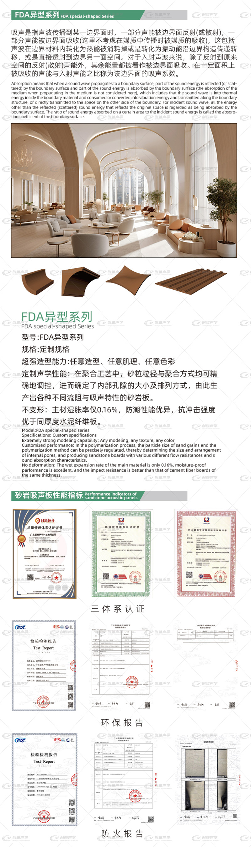 產(chǎn)品介紹:異型砂巖吸聲板又名FDA吸音板、陶晶吸聲板等,其主要成分是輕質(zhì)砂粒,具有A級防火,又環(huán)保,又防潮的特點,非常適合用在消防要求高,又需要吸聲的場所,比如藝術(shù)館,教室,會議室等,材質(zhì)輕盈,特別適合用于天花板