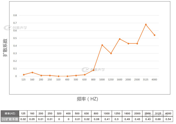 主要特點:D2擴散體是嚴格根據QRD理論公式計算出來的定位序列柵格,它的溝槽深度、寬度能在全方位、多角度的入射聲情況下產生均勻的擴散反射,使人聲更加柔順,高頻變得更加洪亮,具有大廳堂般的效果。擴散頻率范圍: 675Hz-2150Hz. 最高環保性能達E1級。
